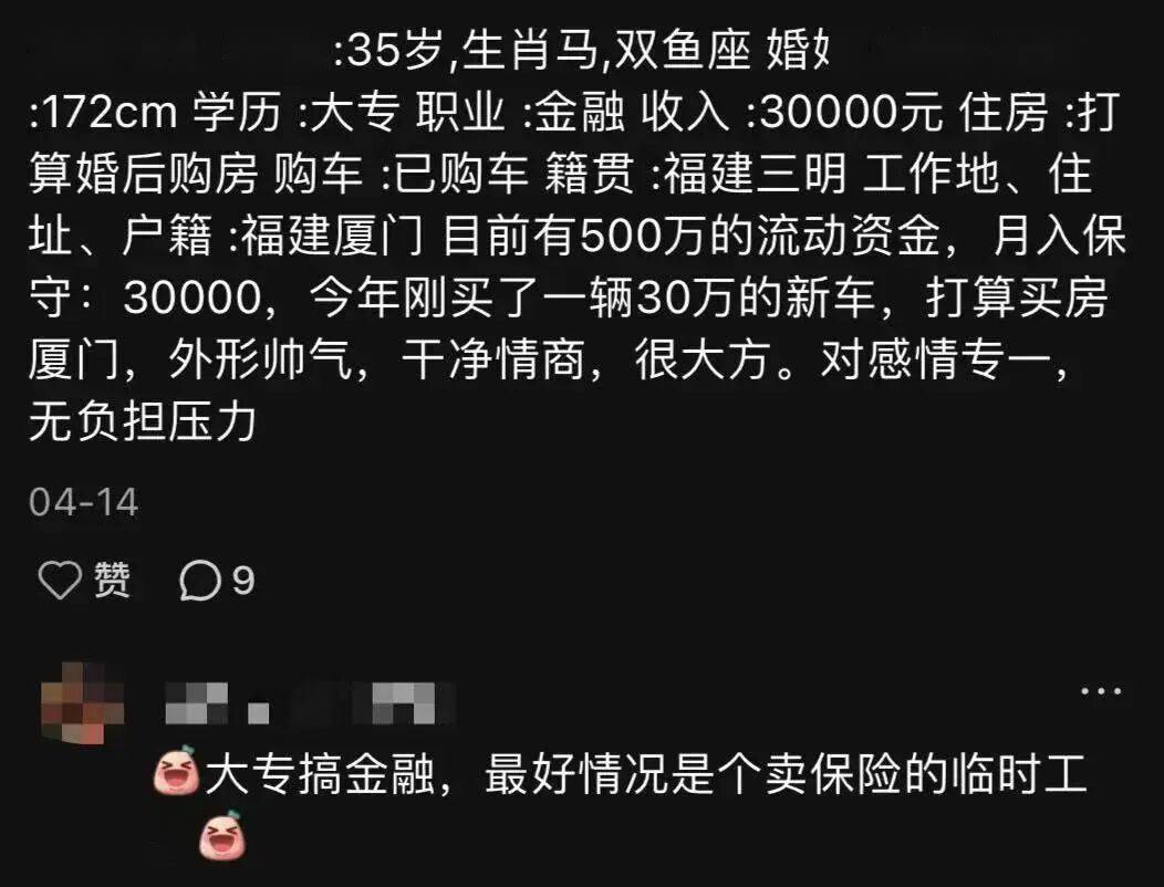 消解了恋爱的浪漫,这种近乎冰凉的量化阐发,大多包含春秋、身高、体沉、婚姻情况等保守相亲需要领会的项目,实则是现代婚恋市场中各类现性蔑视的集中——地区、春秋焦炙、性别分工刻板印象,完全剥离了婚恋关系中的浪漫滤镜?