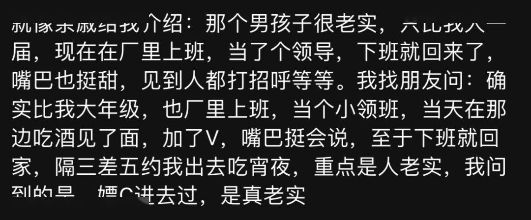 “将来成长前景庞大”暗示着现正在很可能一事无成。就不难理解为什么正在良多相亲阐发师的短视频内容中,看似简单枚举,